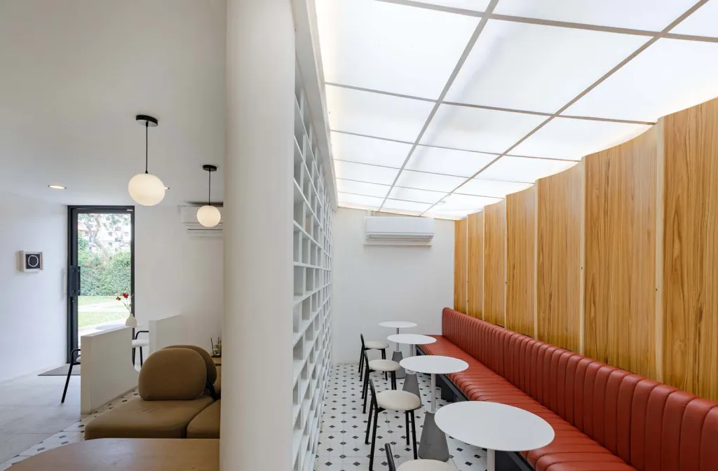 ภายในอาคารทางทีมผู้ออกแบบได้มีโอกาสได้คุยกับทางเจ้าของร้าน ซึ่งทางเจ้าของร้านมีความชื่นชอบในผลงานศิลปะเลยอยากจะเพิ่มฟังชั่น Gallery Space เข้าไปในร้าน เพื่อที่จะนั่งเสพความสวยงามของผลงานศิลปะเลยให้โจทย์กับทางผู้ออกแบบจาก PAOWAN.studio มาว่าอยากในงานศิลปะอยู่ร่วมกับคาเฟ่และผู้คนที่ให้เข้ากัน ทางทีมผู้ออกแบบยังคงคิดแนวคิด Concept คงเดิมจากงานภายนอกนั้นก็คือความผสมผสานระหว่างขนมหวานและงานตกแต่งภายใน เลยนำสไตน์การตกแต่งแนว Mid Century Modern มาใช้ในการตกแต่งภายใน ซึ่งเป็นสไตน์มีความสอดคล้องกับ Concept ที่ทางผู้ออกแบบคิดไว้ Mid Century Modern งานดีไซน์หลากหลายแขนงที่ได้รับอิทธิพลมาจากช่วงหลังปฎิวัติอุตสาหกรรมตะวันตก ไม่ว่าจะเป็นสถาปัตยกรรม เฟอร์นิเจอร์ วงการแฟชัน งานศิลปะแขนงต่าง ๆ จะเป็นแนวงานที่ออกมาเรียบง่าย เน้นใช้รูปทรงของเรขาคณิต เป็นแนวทางการออกแบบ มีการดึงองค์ประกอบของขนมหลากหลายชนิดภายในร้าน